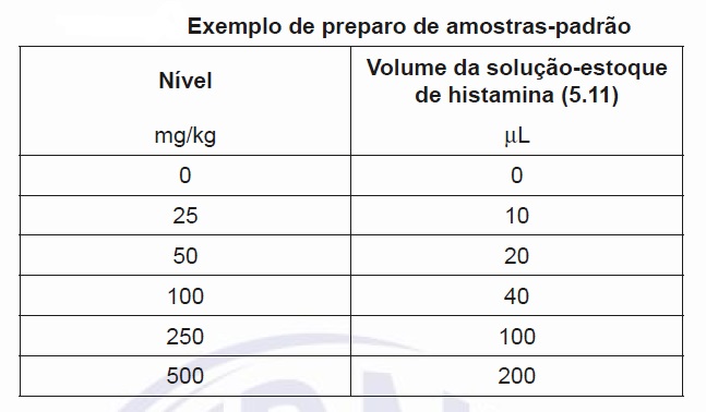 Convém que as amostras-padrão sejam preparadas por suplementação de volumes de solução-estoque de histamina para homogeneizar as amostras preparadas de acordo com essa norma a partir de uma matriz livre de histamina. Adicionar os volumes conforme especificado na tabela abaixo para a amostra livre de histamina e prosseguir para a etapa de extração e, então, derivatização, purificação e LC. Para evitar o efeito matriz e as tendências (bias), preparar uma curva de calibração na mesma matriz (sem histamina) que a amostra analisada.